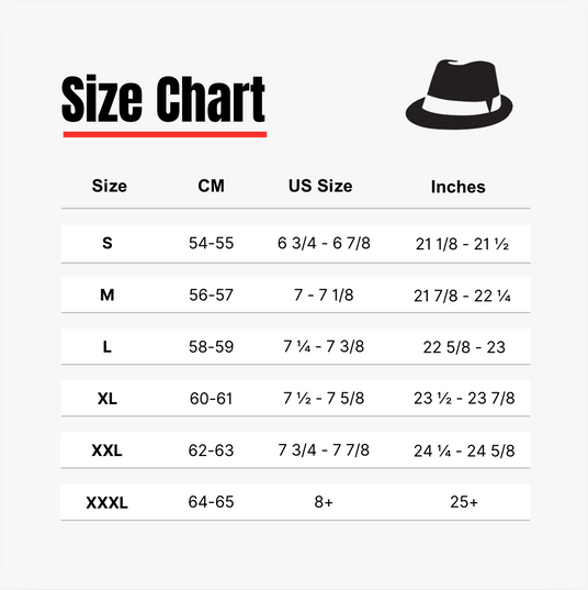 Different manufacturers’ size standards may vary slightly. If your new hat doesn't fit, we will happily exchange it for another size.